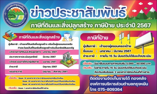 กิจกรรมเด่น อบต.กรุงหยันประชาสัมพันธ์การเสียภาษีที่ดินและสิ่งปลูกสร้างและภาษีป้าย ประจำปี 256729 พฤศจิกายน 256629 กรกฎาคม 2025