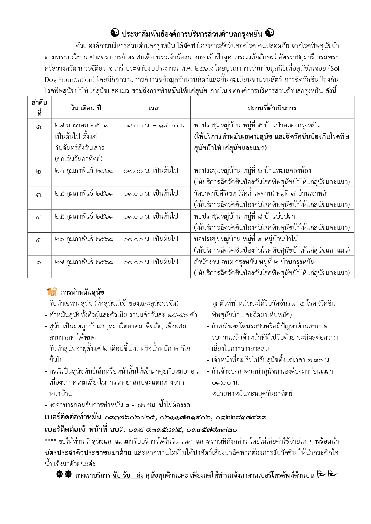 ด้วย องค์การบริหารส่วนตำบลกรุงหยัน ได้จัดทำโครงการสัตว์ปลอดโรค คนปลอดภัย จากโรคพิษสุนัขบ้า ตามพระปณิธาน ศาสตราจารย์ ดร.สมเด็จ พระเจ้าน้องนางเธอเจ้าฟ้าจุฬาภรณวลัยลักษณ์ อัครราชกุมารี กรมพระศรีสวางควัฒน วรขัติยราชนารี ประจำปีงบประมาณ พ.ศ. 2569 โดยบูรณาการร่วมกับมูลนิธิเพื่อสุนัขในซอย (Soi Dog Foundation) โดยมีกิจกรรมการสำรวจข้อมูลจำนวนสัตว์และขึ้นทะเบียนจำนวนสัตว์ การฉีดวัคซีนป้องกันโรคพิษสุนัขบ้าให้แก่สุนัขและแมว รวมถึงการทำหมันให้แก่สุนัข ภายในเขตองค์การบริหารส่วนตำบลกรุงหยัน